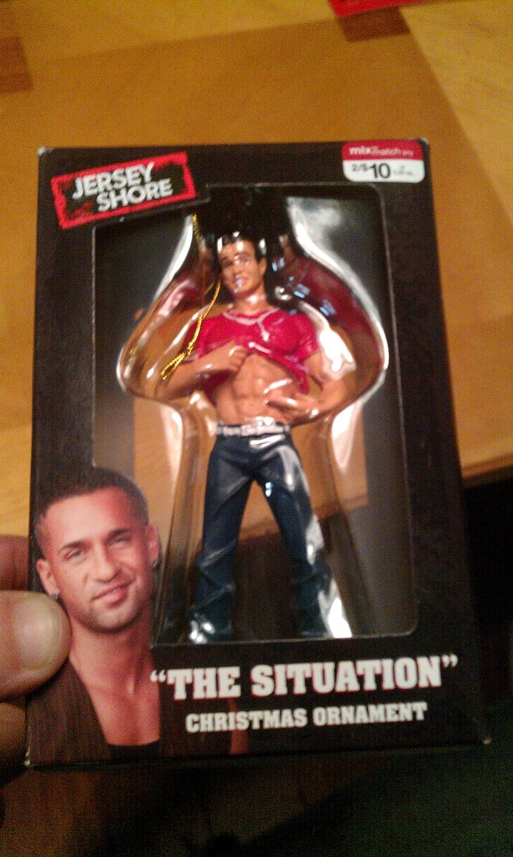 My cousin mocks “The Situation” constantly, so my brother bought him a “The Situation” ornament to hang on his Christmas tree.